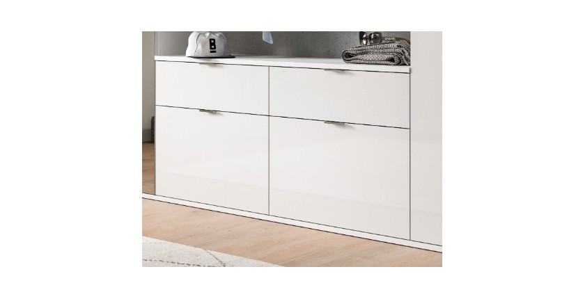 Organisez vos espaces avec le meuble de rangement BODITE, doté de 4 tiroirs spacieux. Avec sa finition en blanc laqué, ce meuble apporte une touche contemporaine et lumineuse à votre salon, séjour ou salle à manger, tout en offrant une solution de rangement pratique et élégante.