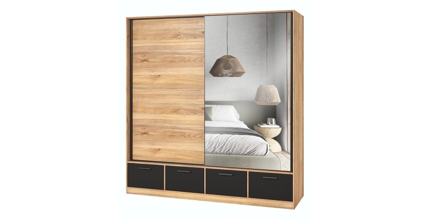 L'armoire EOS se distingue par son style design et son coloris chêne clair, rehaussé par des tiroirs à façade noire, ajoutant une touche d'élégance à votre intérieur. Sa structure en panneaux de particules haute densité assure une robustesse et une durabilité optimales, tandis que ses deux portes coulissantes, dont une avec miroir, offrent un accès facile à votre garde-robe.