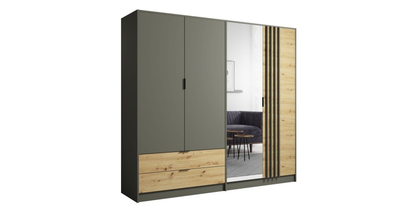 Apportez une touche d'élégance et de praticité à votre chambre avec l'armoire IZO. Cette armoire spacieuse à 4 portes, dont une avec un grand miroir, est conçue pour répondre à tous vos besoins de rangement. Avec ses finitions en gris graphite et chêne clair, elle s'intègre parfaitement dans un intérieur moderne tout en offrant une solution de rangement fonctionnelle.