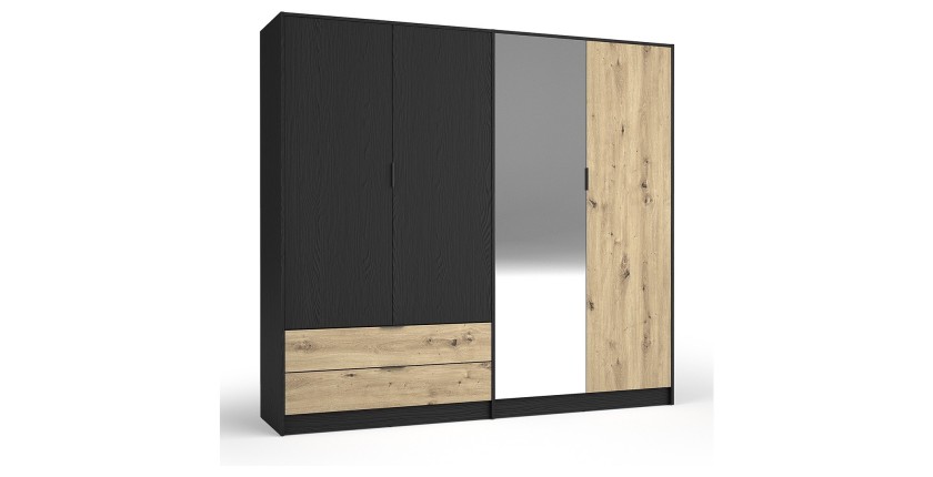 Armoire MELODY - 4 Portes, 2 Tiroirs - 220x203x54 cm - Noir Graphite et Chêne Clair