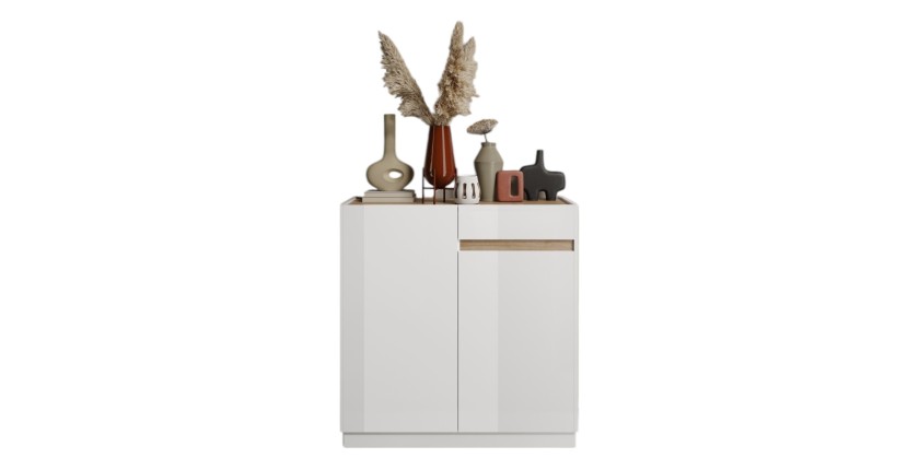 Le buffet FANZY est un meuble à la fois esthétique et fonctionnel, idéal pour sublimer votre salle à manger ou votre salon. Son design moderne et son association de blanc laqué et chêne clair lui confèrent une allure élégante et intemporelle. Avec ses 2 portes et 1 tiroir, ce buffet offre un grand espace de rangement tout en restant compact et adapté aux intérieurs contemporains.
