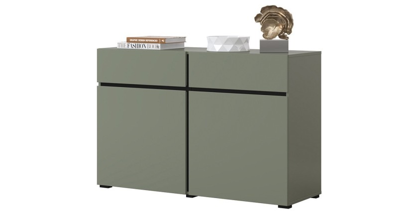 Ajoutez une touche moderne à votre espace avec le buffet HAVANA. Avec ses dimensions de 119,4 cm de largeur, 78,3 cm de hauteur et 40 cm de profondeur, ce meuble compact offre un espace de rangement idéal avec ses 2 portes battantes et 2 tiroirs. Le coloris vert sauge associé au noir mat crée une esthétique élégante et chaleureuse, parfaite pour un salon ou une chambre moderne.