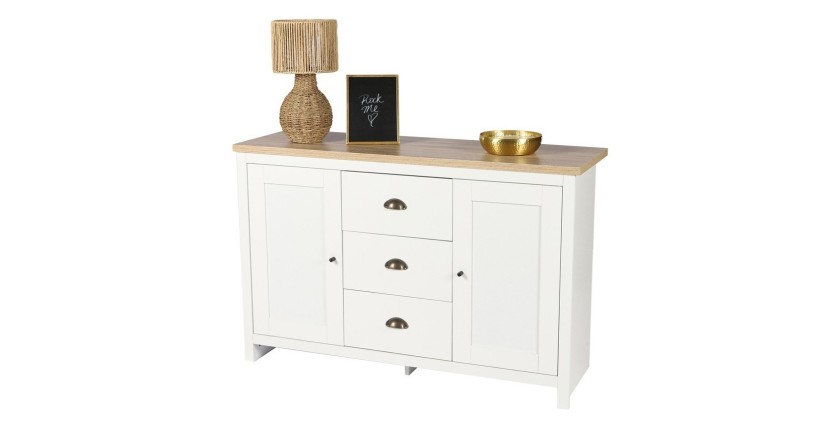 Buffet avec 2 portes et 3 tiroirs design colonial – Collection MADERA, coloris blanc et plateau chêne clair