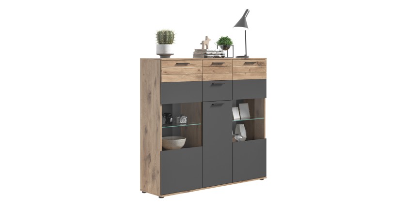 Le Buffet haut SELMA, en gris anthracite et chêne clair, est le meuble idéal pour allier fonctionnalité et esthétique dans votre salon. Avec sa porte vitrée et ses dimensions optimisées, il offre un espace de rangement élégant et pratique pour vos objets décoratifs.
