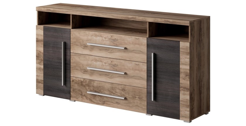 Alliant praticité et élégance, le buffet 2 portes 3 tiroirs de la collection BRAZZA s’impose comme une solution de rangement idéale pour votre séjour ou votre salle à manger. Avec ses 7 niches de rangement dont 3 ouvertes sur le haut, ses 4 étagères internes et ses 3 tiroirs centraux, il offre un agencement intelligent et accessible pour tous vos objets du quotidien. Les grandes poignées design et la finition texturée lui donnent une touche résolument moderne.