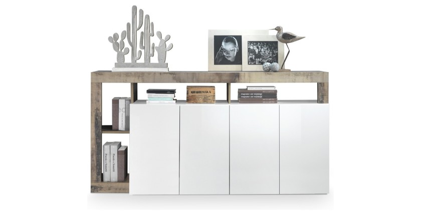 Buffet BURA – 4 portes – Blanc laqué brillant et chêne clair – Design moderne
