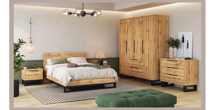 - CARACTÉRISTIQUES : Chevets composé d'un grand tiroir. Lit coffre 140x200 avec sommier inclus, Armoire avec 4 portes battantes et 2 tiroirs. Commode avec 3 grands tiroirs.