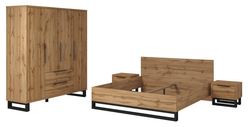 - CARACTÉRISTIQUES : Chevets composé d'un grand tiroir. Lit 140x200 avec sommier inclus, Armoire avec 4 portes battantes et 2 tiroirs. Commode avec 3 grands tiroirs.