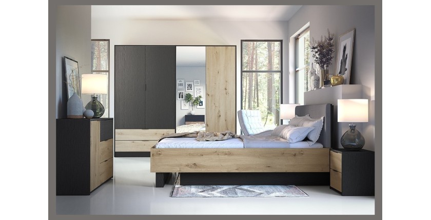 Transformez votre chambre avec l'élégance moderne de la collection MELODY. Cet ensemble complet de meubles comprend tout ce dont vous avez besoin pour aménager un espace confortable et stylé. Avec des finitions en noir graphite et chêne clair, chaque pièce de cet ensemble s'harmonise parfaitement pour créer une ambiance contemporaine et raffinée.