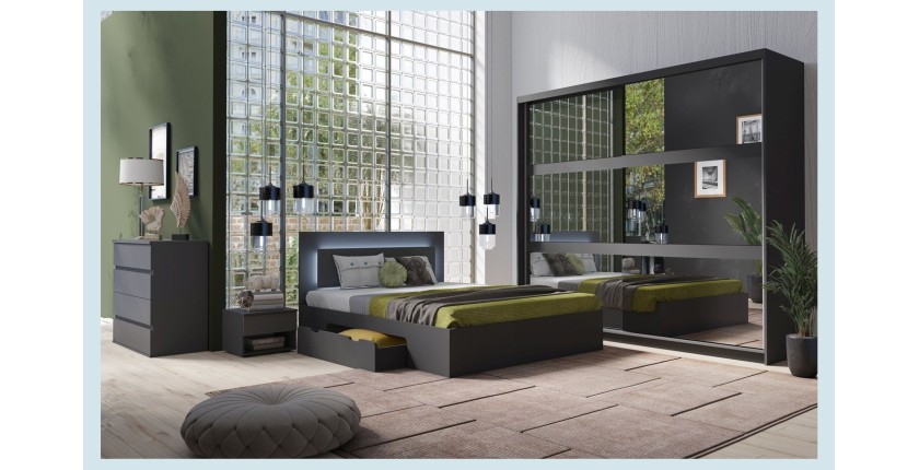 Ensemble chambre moderne NOFI - Lit 180x200 cm avec sommier, 2 tiroirs, chevets, armoire et commode - Collection NOFI en gris graphite