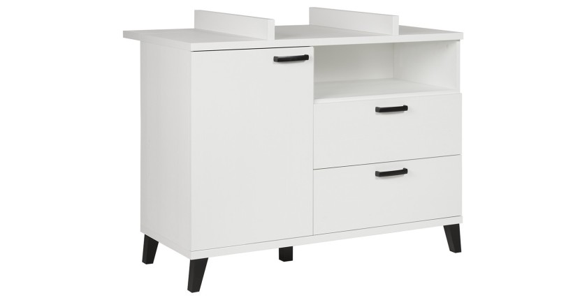 Ses dimensions de L120 × H97 × P66 cm permettent d’intégrer 2 tiroirs, 1 niche ouverte et 1 porte avec étagère, afin d’organiser facilement vêtements, couches et accessoires de bébé. Sa finition blanche s’harmonise aisément avec tous les styles de décoration.