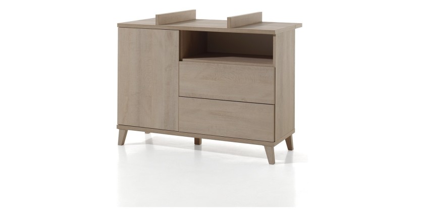Avec ses dimensions de L120 × H89 × P48 cm, la commode LOUISE intègre 2 tiroirs, 1 niche ouverte et 1 porte avec étagère. Vous disposez ainsi de tout le nécessaire pour ranger efficacement les vêtements, couches et accessoires de votre bébé.