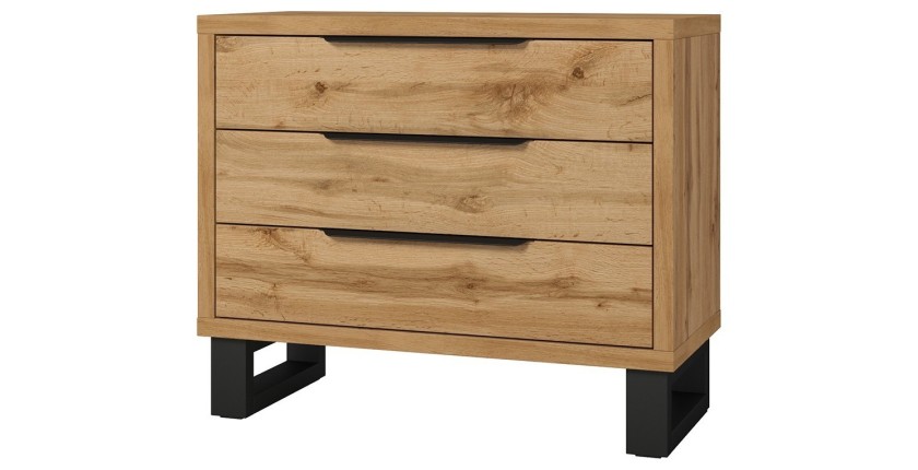 Adoptez la commode MILOS, un meuble de rangement inspiré du style industriel qui combine praticité et design. Ses 3 grands tiroirs en finition chêne brut et ses pieds design noir lui confèrent une allure moderne et tendance.