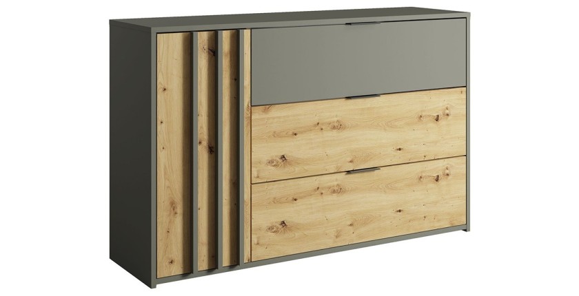 Apportez une touche de modernité et de fonctionnalité à votre chambre avec la commode IZO. Avec ses dimensions généreuses et son design épuré, cette commode en chêne clair et gris graphite est idéale pour optimiser votre espace tout en ajoutant une touche de sophistication. Dotée de 3 tiroirs spacieux et d'une porte battante, elle offre de nombreux rangements pour organiser efficacement vos vêtements, linge de maison, et autres accessoires.