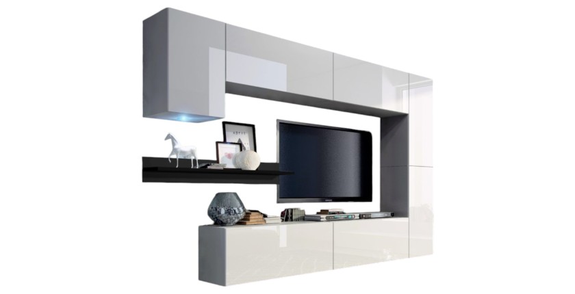- CARACTÉRISTIQUES : Ensemble de 8 meubles pour composition murale TV, collection CEPTO, 6 étagères dont une murale, 7 portes, leds.