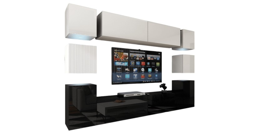 • Ensemble meubles de salon suspendus bas noir, haut blanc collection CEPTO. 256cm, 10 meubles, leds.