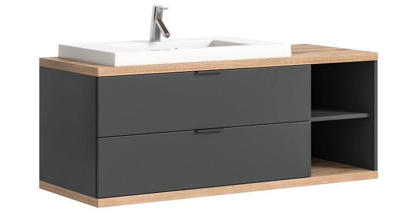 Large de 130 cm, il dispose de 2 tiroirs spacieux pour organiser serviettes, produits de soin et accessoires. Une niche ouverte latérale vous permet de garder vos indispensables à portée de main.