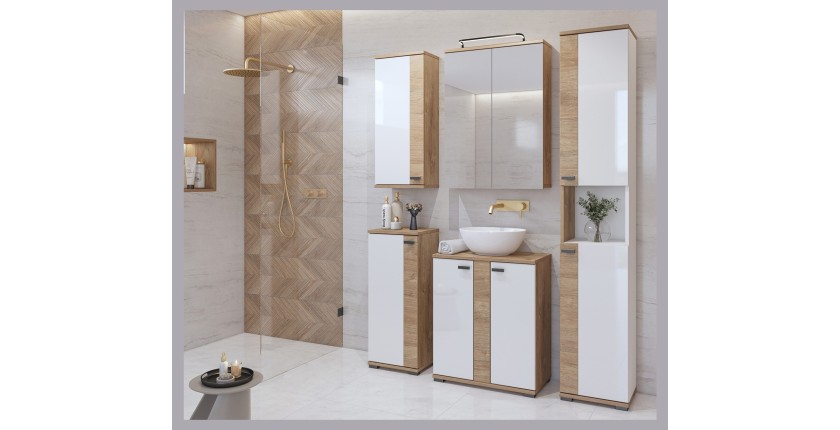 Transformez votre salle de bain avec l'ensemble BALEA, composé de 5 meubles essentiels : un meuble haut à suspendre, un meuble bas 1 porte, un meuble sous vasque 2 portes, un meuble haut de salle de bain, et une colonne de salle de bain. Ce set allie design moderne et rangements optimisés, grâce à son coloris chêne et blanc, pour un style élégant et naturel.