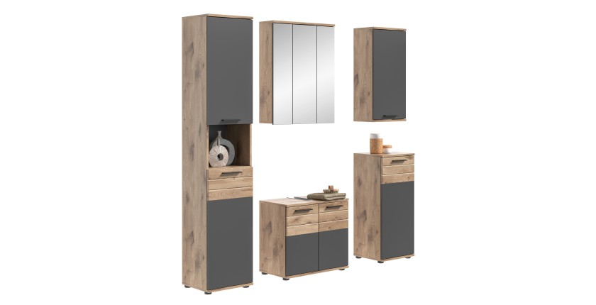 L'ensemble de salle de bains SELMA comprend un meuble sous vasque, une colonne, une armoire de rangement avec miroir et deux demi-colonnes, offrant à la fois un design moderne et une grande capacité de rangement. Avec sa finition en gris anthracite et chêne clair, cet ensemble apportera une touche élégante et raffinée à votre salle de bains.