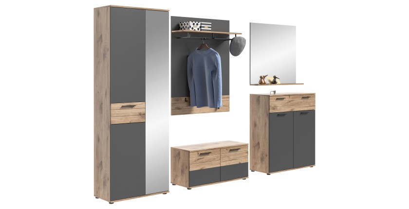 Transformez votre salle de bain avec l'ensemble SELMA, qui comprend un meuble sous vasque, une demi colonne de rangement et un miroir. Conçu dans un élégant gris anthracite et chêne clair, cet ensemble est parfait pour apporter style et organisation à votre espace.