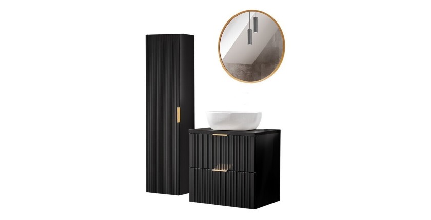 Le meuble sous vasque (60 × 57 × 46 cm) dispose de 2 tiroirs spacieux pour vos accessoires. La colonne suspendue avec porte offre un espace de rangement supplémentaire pour serviettes et produits de toilette. Le plan vasque (60 × 2 × 46 cm) est surmonté d’une vasque ronde en céramique (41 × 15 × 41 cm), résistante et facile d’entretien.