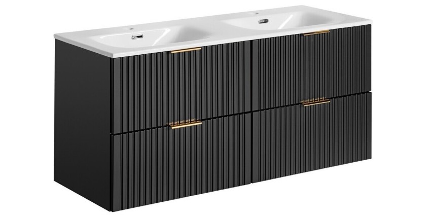 Le meuble (120 × 57 × 46 cm) est doté de 4 tiroirs spacieux pour ranger serviettes, produits de toilette et accessoires. La double vasque encastrée (120 × 17 × 46 cm) permet une utilisation simultanée, idéale pour un usage quotidien à deux. Les siphons inclus facilitent l’installation.