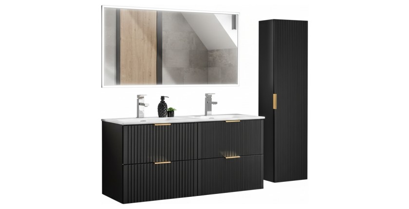 Avec sa finition noir mat et ses lignes épurées, cet ensemble NOXERA s’intègre parfaitement dans une salle de bain contemporaine. Le miroir rectangulaire LED (68 × 123 × 3 cm) apporte une lumière fonctionnelle et élégante, tandis que la colonne suspendue (35 × 140 × 25 cm) complète l’ensemble en offrant un rangement vertical pratique.