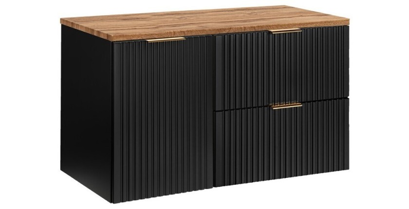 Alliez design et praticité avec le meuble sous vasque NOXERA. Large de 100 cm, il comprend deux tiroirs spacieux, une porte avec panier à linge intégré et un plan vasque assorti. Un meuble moderne et fonctionnel qui facilite l’organisation de votre salle de bain.