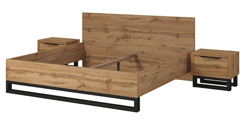 L'ensemble lit et chevets de la MILOS en couchage 140x200 est l'élément incontournable pour une chambre à coucher moderne et élégante. Avec son coloris chêne brut et ses pieds design noir, il apporte une touche de sophistication à votre pièce.