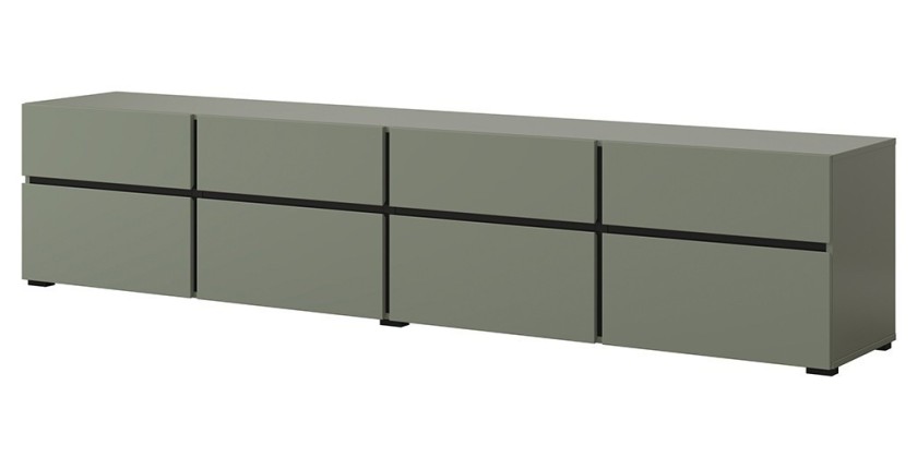 Apportez une touche contemporaine à votre salon avec le meuble TV XL HAVANA. Avec ses dimensions généreuses de 225 cm de largeur, 48 cm de hauteur et 40 cm de profondeur, ce meuble est doté de 4 portes abattantes et de 4 tiroirs, offrant un espace de rangement optimal pour vos équipements multimédias et objets décoratifs. Le coloris vert sauge associé au noir mat crée une atmosphère moderne et chaleureuse dans votre espace de vie.