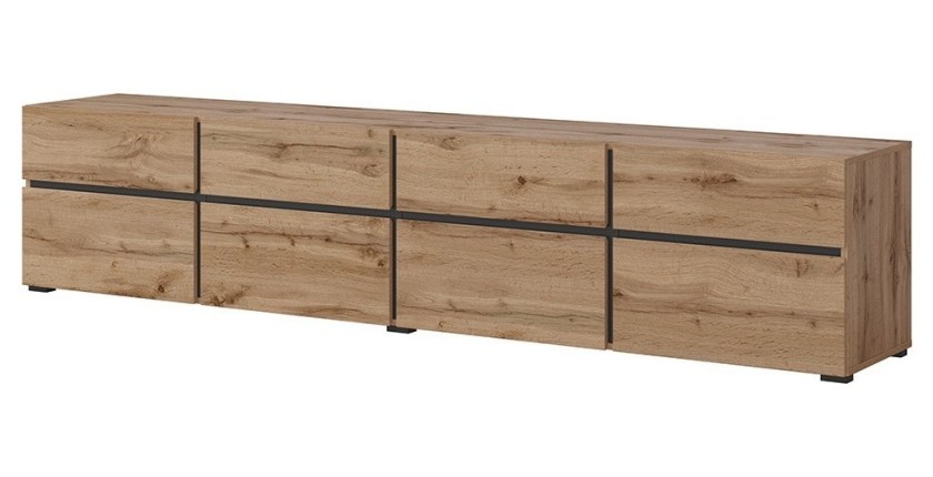 Apportez une touche contemporaine à votre salon avec le meuble TV XL HAVANA. Avec ses dimensions généreuses de 225 cm de largeur, 48 cm de hauteur et 40 cm de profondeur, ce meuble est doté de 4 portes abattantes et de 4 tiroirs, offrant un espace de rangement optimal pour vos équipements multimédias et objets décoratifs. Le coloris chêne associé au noir mat crée une atmosphère moderne et chaleureuse dans votre espace de vie.