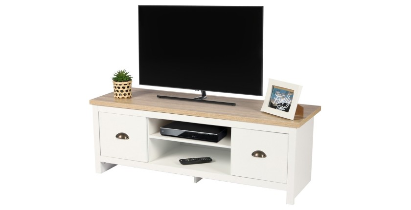 Meuble TV design colonial avec 2 tiroirs et 2 niches – Collection MADERA, coloris blanc et plateau chêne clair