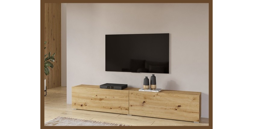 Meuble TV 180cm collection EVA. 1 grande porte abattante. Couleur chêne et noir. Meuble à poser ou à suspendre.
