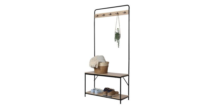 Ajoutez une touche fonctionnelle et stylée à votre entrée avec le porte manteau PHOEBE. Doté de 2 étagères pour vos chaussures, de 5 crochets pour vos manteaux et d'un banc d'assise pratique, ce meuble allie style industriel et praticité. Sa structure en métal noir et ses panneaux en chêne clair lui confèrent une allure moderne et robuste.
