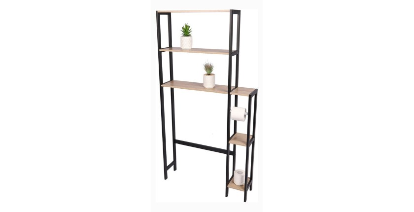 Optimisez l'espace de vos toilettes avec le meuble contour WC HOLBORN. Ce meuble de 78 cm de largeur et 150 cm de hauteur offre 6 étagères pratiques et un dérouleur de papier WC intégré. Sa structure en métal noir et son design industriel s'accordent parfaitement avec un intérieur moderne. Les panneaux de particules coloris chêne apportent une touche naturelle à ce meuble pratique et fonctionnel.