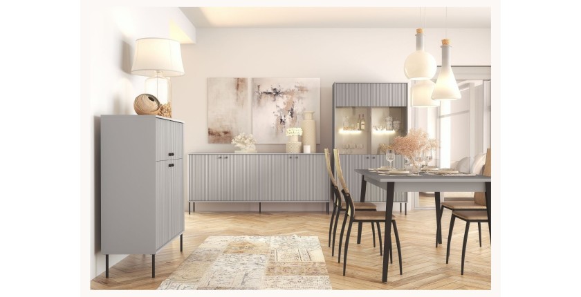 Transformez votre salle à manger avec notre ensemble de meubles de la collection ISIS, en coloris gris. Cet ensemble inclut un vaisselier, un buffet 4 portes, une vitrine et une table extensible pour 8 personnes, combinant design moderne et fonctionnalité pour un intérieur élégant et pratique.