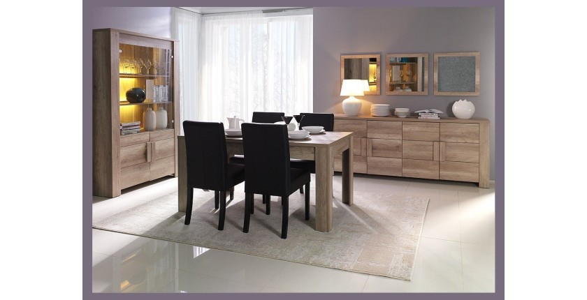 Transformez votre salle à manger avec l'ensemble FARRA, composé d'une vitrine avec LED, d'un buffet, de 3 miroirs, et d'une table de salle à manger . Cet ensemble combine des lignes modernes et un design fonctionnel, parfait pour créer une ambiance élégante et contemporaine.