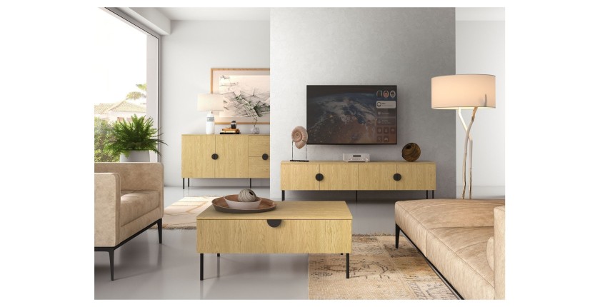 Ensemble de Meubles : Meuble TV 4 Portes, Table Basse, Petit Buffet - Couleur Chêne - Collection MONDO