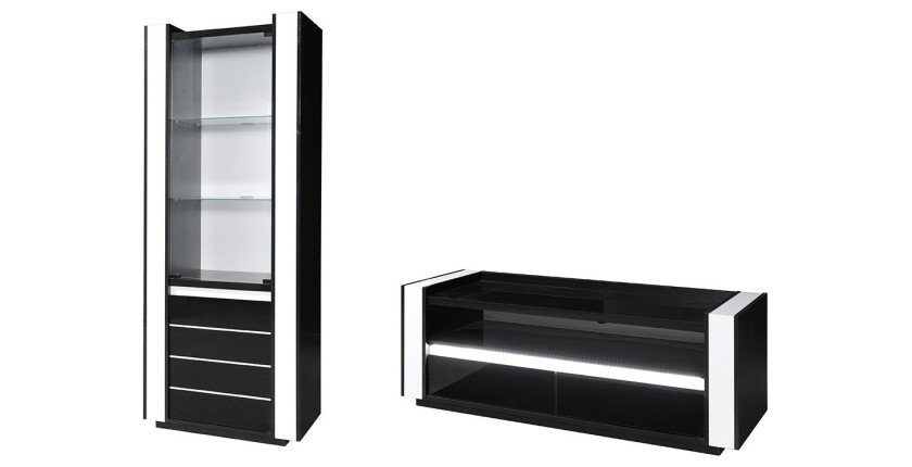 Apportez une touche moderne à votre salon avec l'ensemble LINA, comprenant une vitrine petit modèle avec LED et un meuble TV avec LED. Le design contemporain en noir et blanc ajoute une ambiance sophistiquée et lumineuse à votre espace.