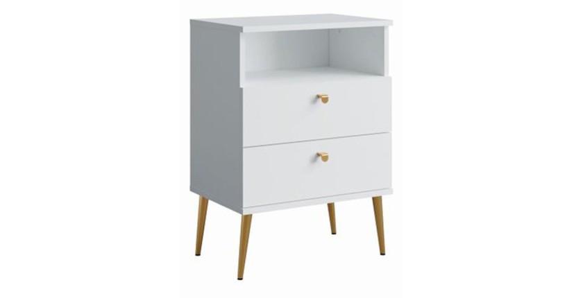 Apportez une touche chic et contemporaine à votre chambre avec la table de chevet AURORA. Son coloris blanc alpin associé à ses pieds en métal doré en fait un véritable atout déco, alliant fonctionnalité et raffinement.